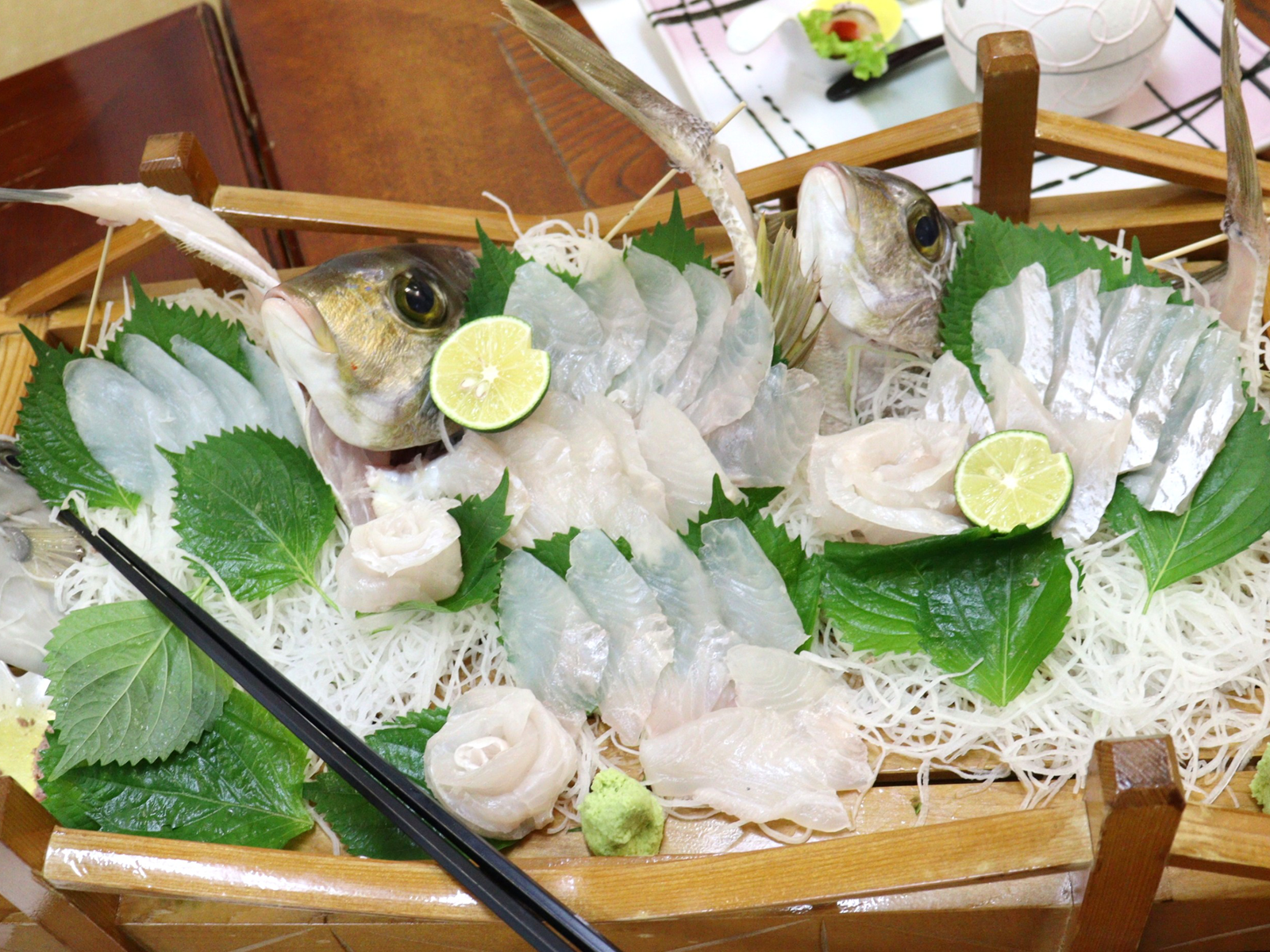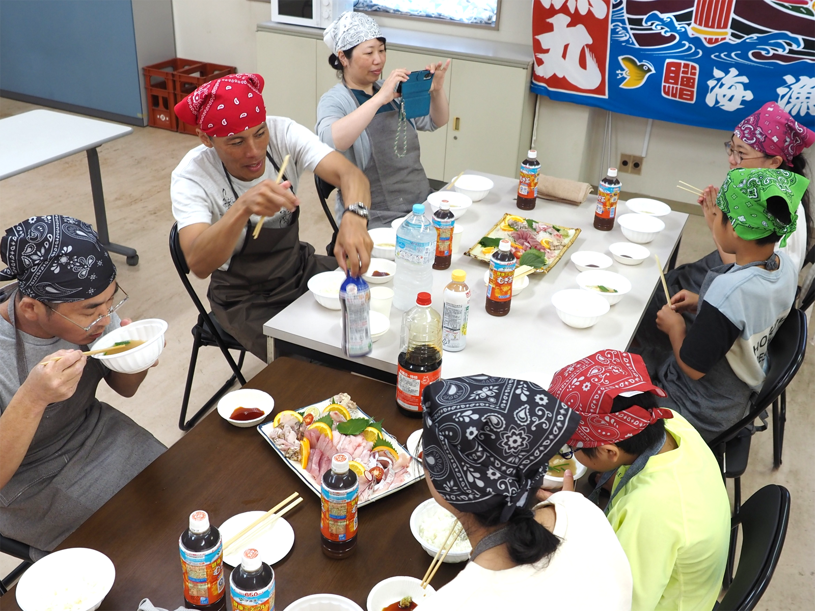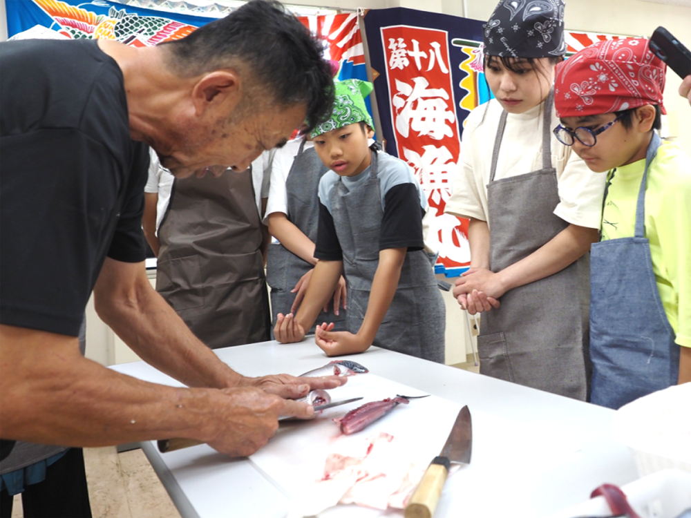 釣りの醍醐味!釣った魚を自分たちでさばき、鮮度の高い魚をランチで味わえるプランが大人気。民宿白木屋の大将が魚の捌き方を手本として披露すると、参加者は自分たちで挑戦!自らさばいた魚をお造りや海鮮丼にし、贅沢な昼食を楽しんだ。